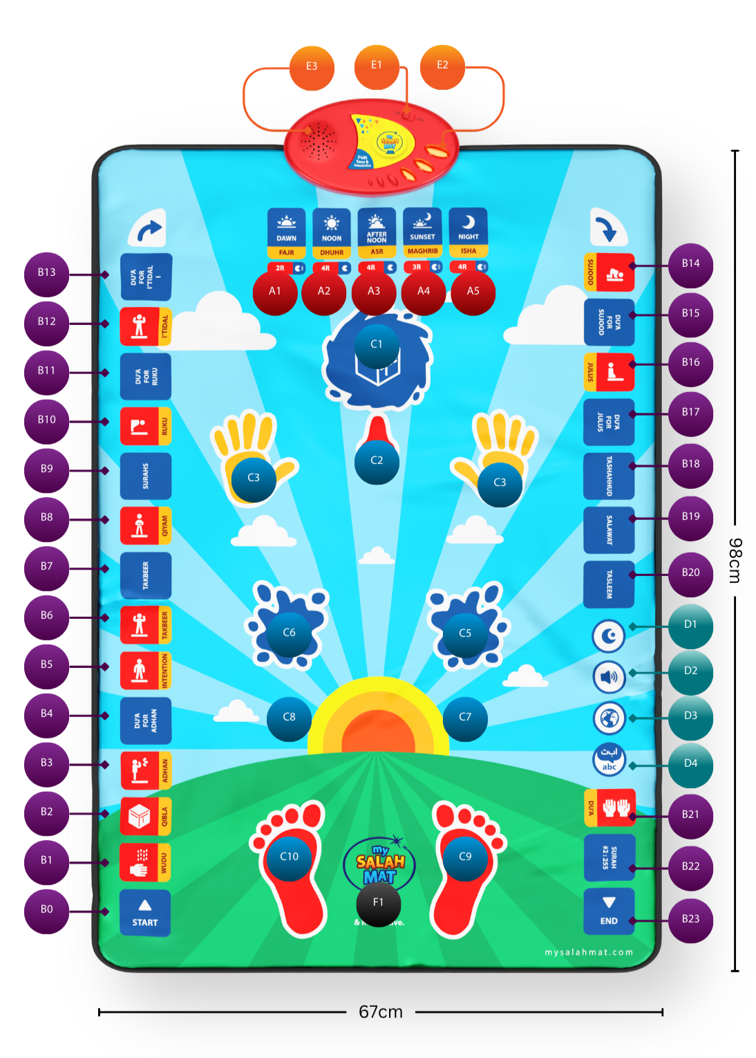 Namaz kılmak isteyen her yaştan kadın ve erkek bu akıllı seccadeyi rahatlıkla kullanabilir. Özellikle namaza yeni başlamak isteyenler veya sureleri ve hareketleri öğrenmek isteyenler için ideal bir yardımcıdır.